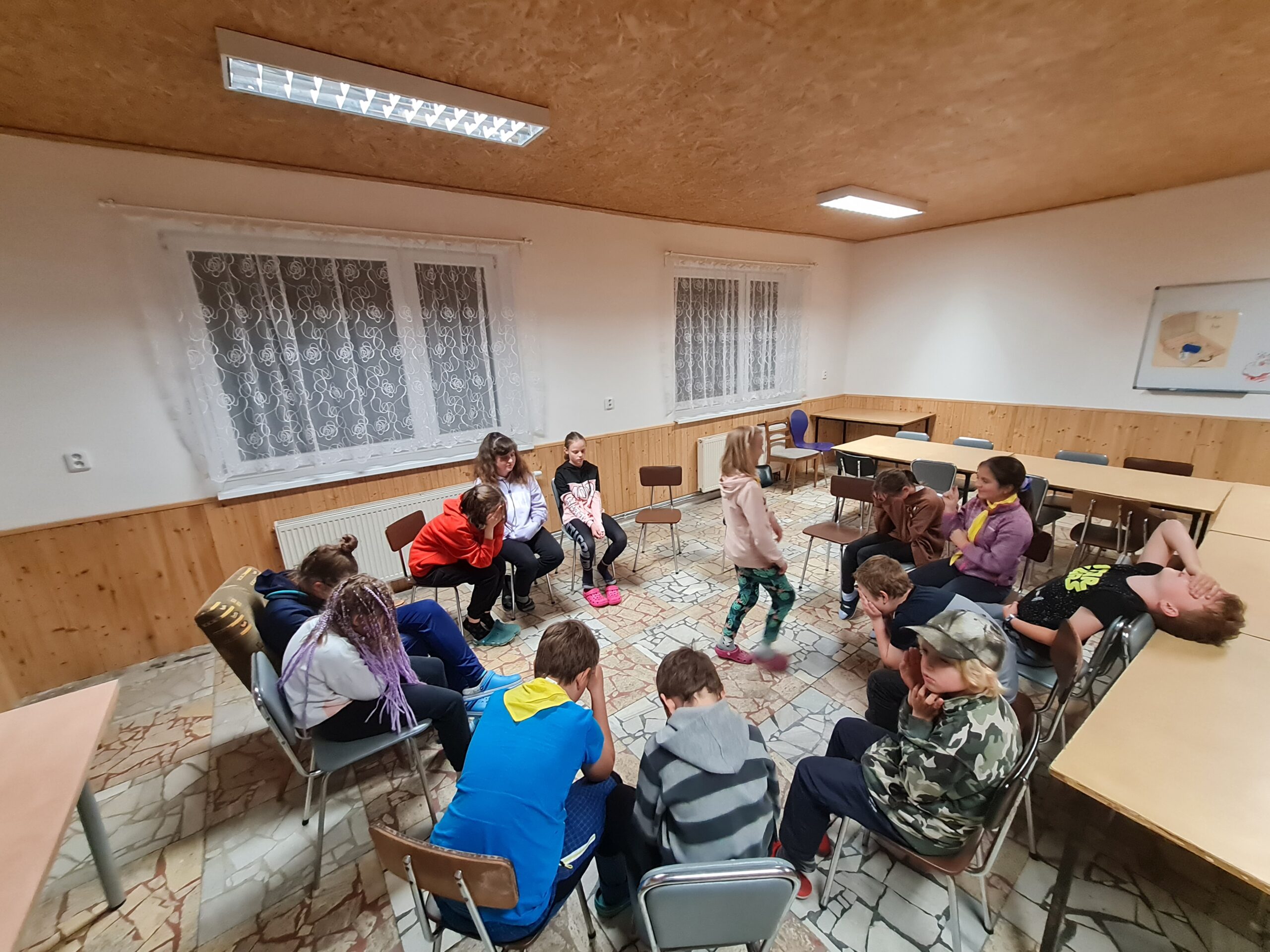 Po příchodu nás nejprve čekalo překvapení v podobě objevu našeho prvního kouzelného tvora – našli jsme kůroleza Větvíka. Potom jsme vybalili jídlo, rozdělili jsme si pokoje a sešli se dole v jídelně, kde jsme si řekli pravidla, která budeme na chatě dodržovat. Rozdělili jsme se do skupinek, které se budou střídat spolu s kuchtíky (Vašek a Tom, kteří si plnili odborku Kuchař) v přípravě jídla. První skupinka se hned pustila do večeře a zbytek hrál různé seznamovačky, aby nám čekání na jídlo rychle uteklo. Na večeři byly bagetky se salátem, sýrem, šunkou a dresinkem a bylo to výborné. Po večeři jsme si šli vybalit spacáky a chystali jsme se na spaní. Jasně, že jsme neusli hned, “chvíli” jsme si povídali. 🙂