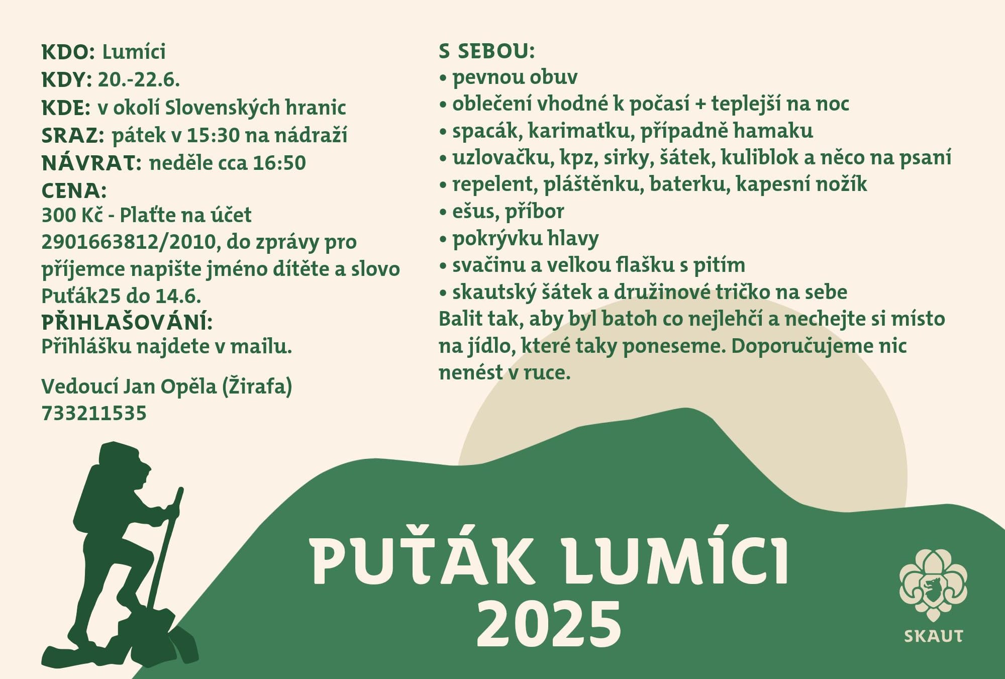 Prosím kontrolujte stránky před odjezdem na tábor. Pokud dojde ke změně, budeme Vás informovat.